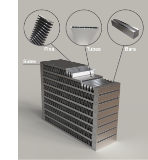The core is constructed by layering the individual components as illustrated; before everything is brazed to form a single core. Easily confused with a plate and bar heat exchanger. The difference being, that the tube is a single extruded tube not like a plate and bar that is built up with individual components that make up the tube.
